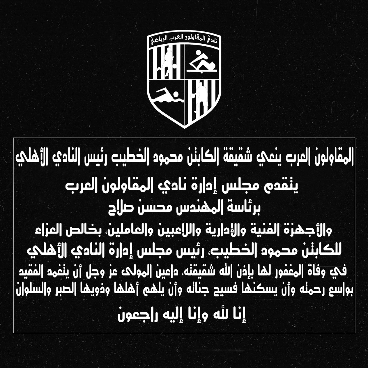 تقدم مجلس إدارة نادي المقاولون العرب، برئاسة المهندس محسن صلاح، والأجهزة الفنية والإدارية واللاعبين والعاملين، بخالص العزاء، للكابتن محمود الخطيب، رئيس مجلس إدارة النادي الأهلي، في وفاة المغفور لها بإذن الله شقيقته، داعين المولى عز وجل أن يتغمد الفقيدة بواسع رحمته وأن يسكنها فسيح جناته وأن يلهم أهلها وذويها الصبر والسلوان.