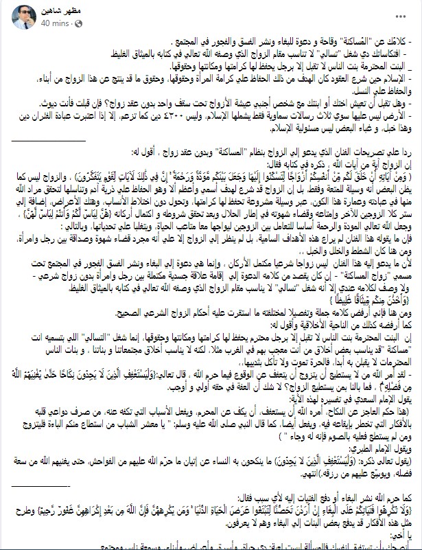 وكتب مظهر شاهين تدوينة على الفيس بوك: "ردا علي تصريحات الفنان الذي يدعو إلي الزواج بنظام "المساكنة" وبدون عقد زواج، أقول له: إن الزواج آية من آيات الله، ذكره في كتابه فقال: ﴿ وَمِنْ آيَاتِهِ أَنْ خَلَقَ لَكُم مِّنْ أَنفُسِكُمْ أَزْوَاجًا لِّتَسْكُنُوا إِلَيْهَا وَجَعَلَ بَيْنَكُم مَّوَدَّةً وَرَحْمَةً ۚ إِنَّ فِي ذَٰلِكَ لَآيَاتٍ لِّقَوْمٍ يَتَفَكَّرُونَ﴾"