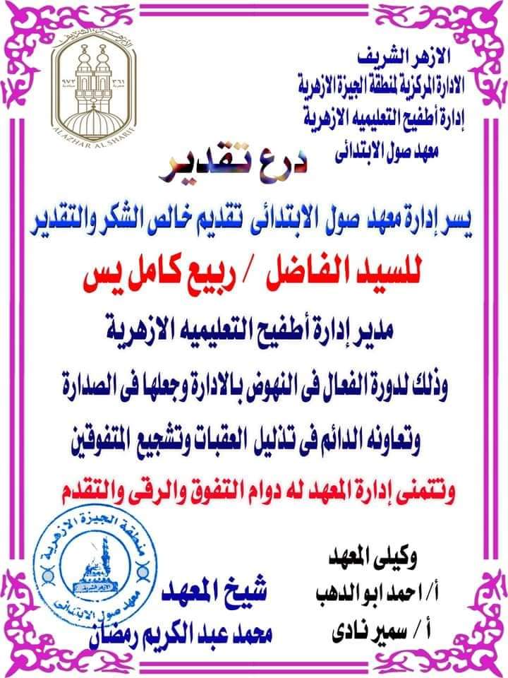 كرم مسؤولو حي أطفيح الشيخ ربيع كامل ياسين مدير عام الإدارة التعليمية الأزهرية بأطفيح، في ديوان وعاظ معهد صـــــول الابتدائي، تقديرا لجهوده في الارتقاء والنهوض بالإدارة.