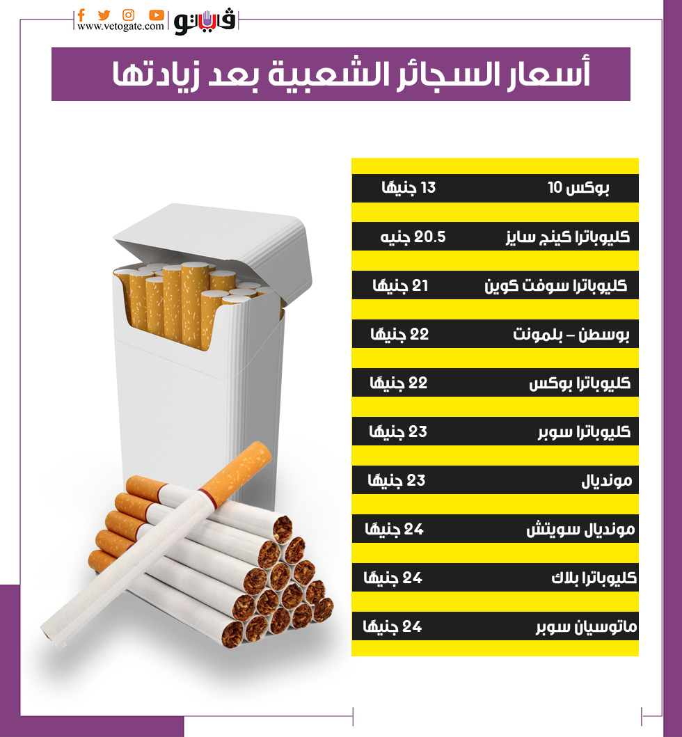 أسعار السجائر الشعبية بعد زيادتها| إنفوجراف السبت 03/سبتمبر/2022 - 11:12 م 9/3/2022 11:12:10 PM رفع أسعار السجائر الشعبية شارك طباعة 18 حجم الخط شارك طباعة