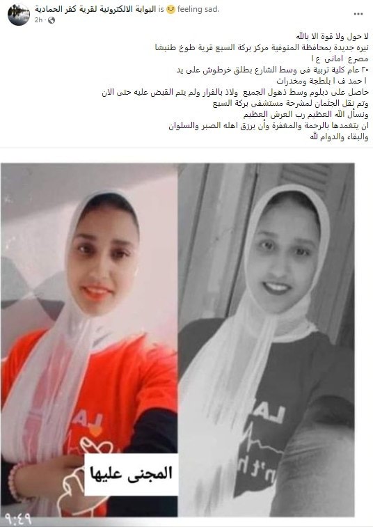 بينما نشر محمد حسن الوكيل صورةَ الفتاة الضحية، وعلق عليها كاتبًا: "تسود حالة من الحزن بين أبناء قرية طوخ طنبشا بمركز بركة السبع بمحافظة المنوفية عقب مقتل طالبة بكلية التربية الرياضية بطلق خرطوش في الظهر، حادث نيرة يتكرر للمرة الثالثة".