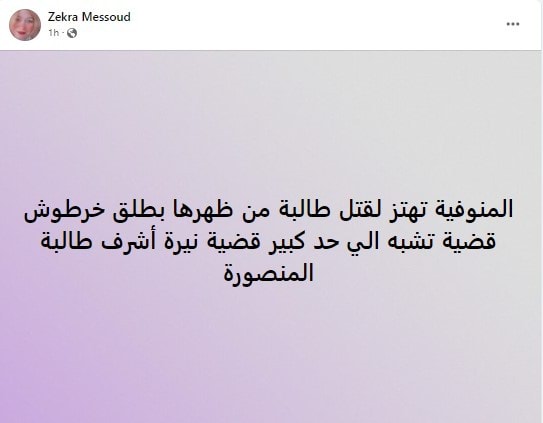 وعلقت ذكرى محمود قائلة: "المنوفية تهتز لقتل طالبة من ظهرها بطلق خرطوش.. قضية تشبه إلى حد كبير قضية نيرة أشرف طالبة المنصورة".