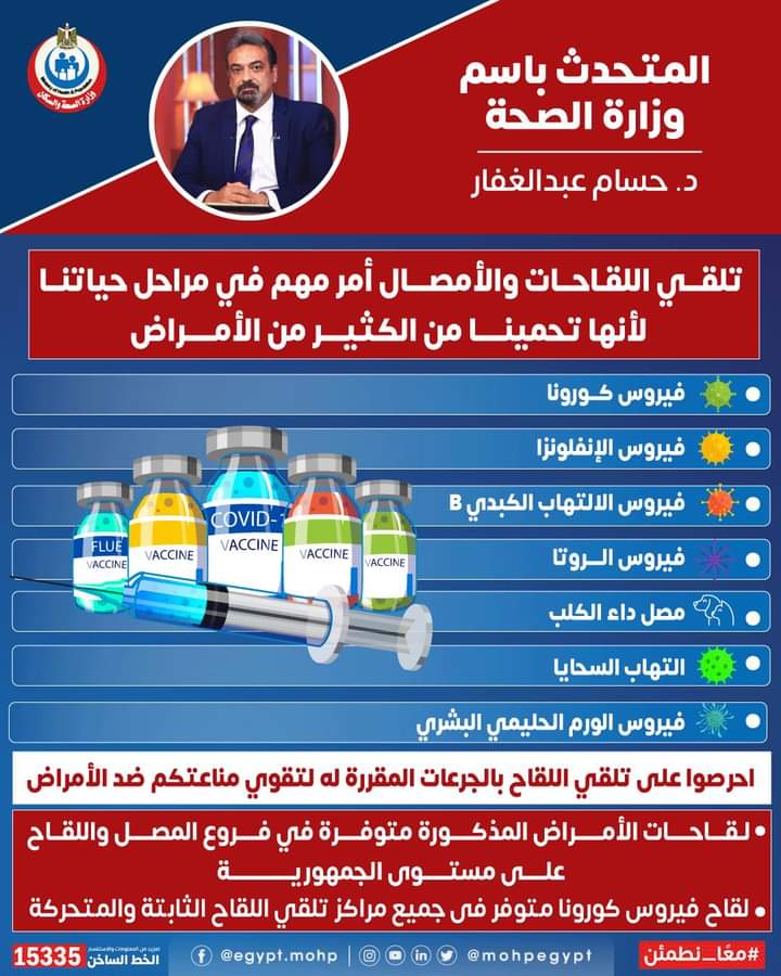 وأوضح الدكتور حسام عبد الغفار أن لقاحات الأمراض المذكورة متوفرة في فروع المصل واللقاح على مستوى الجمهورية كما أن لقاح فيروس كورونا متوفر فى جميع مراكز تلقي اللقاح الثابتة والمتحركة.