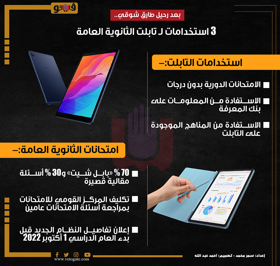 بعد رحيل طارق شوقي.. 3 استخدامات لـ تابلت الثانوية العامة | إنفوجراف الأحد 04/سبتمبر/2022 - 08:40 م 9/4/2022 8:40:48 PM سمر محمد شارك طباعة 18 حجم الخط شارك طباعة تابلت الثانوية العامة الثانوية العامة حقيقة إلغاء تابلت الثانوية العامة طارق شوقى رضا حجازي وزير التعليم امتحانات الثانوية العامة المركز القومي للامتحانات نظام التعليم الجديد العام الدراسي الجديد موعد انطلاق العام الدراسي الجديد