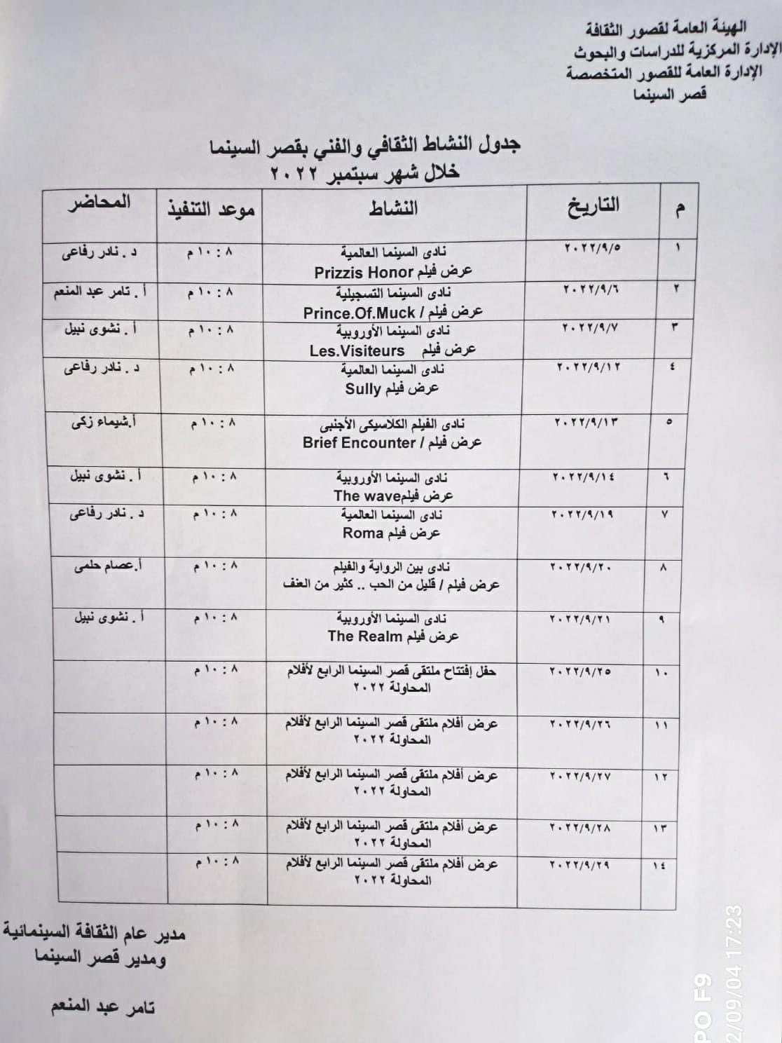 كشف قصر ثقافة السينما والتابع للهيئة العامة لقصور الثقافة، عن برنامج الفعاليات الفنية والثقافية والندوات الفكرية خلال شهر سبتمبر الجاري، وذلك بمقره بجاردن سيتي.