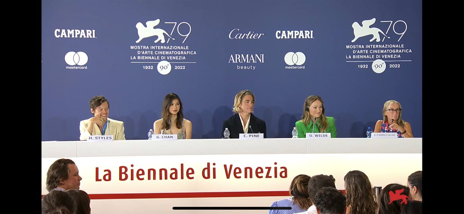 وسُئلت أوليفيا وايلد التي تربطها علاقة غرامية ببطل الفيلم هاري ستايلز، عما إذا كانت هي وهاري ستايلز سيعملان معًا مرة أخرى في المستقبل، فطلبت الانتقال للسؤال التالي.