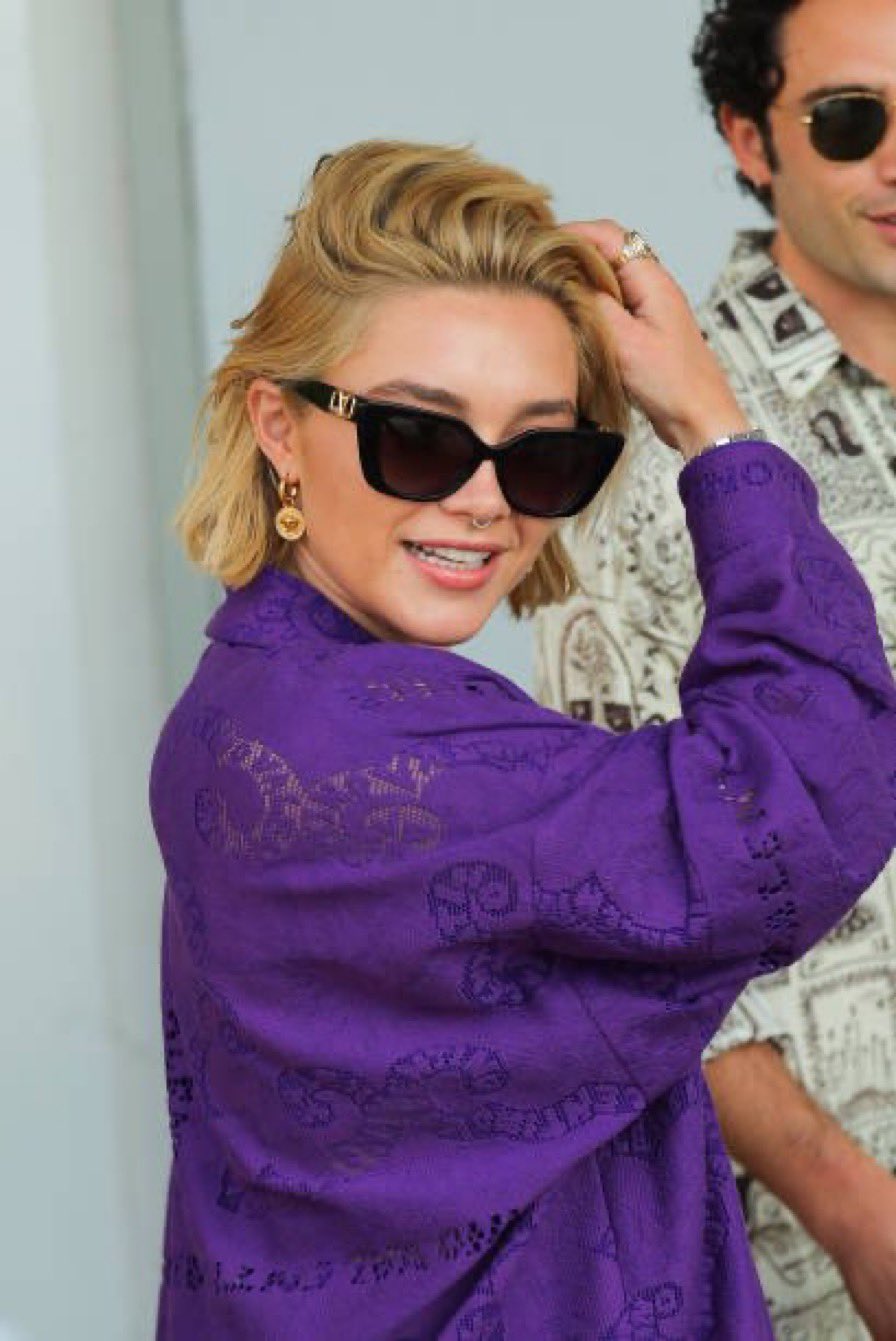 وتألقت فلورنس بيو بمظهر شبابي أنيق، فارتدت طقم بنفسجي اللون أظهر جمال بشرتها وشعرها الأشقر، واستكملت مظهرها الأنيق بمجوهرات ذهبية بسيطة ونظارة شمس.