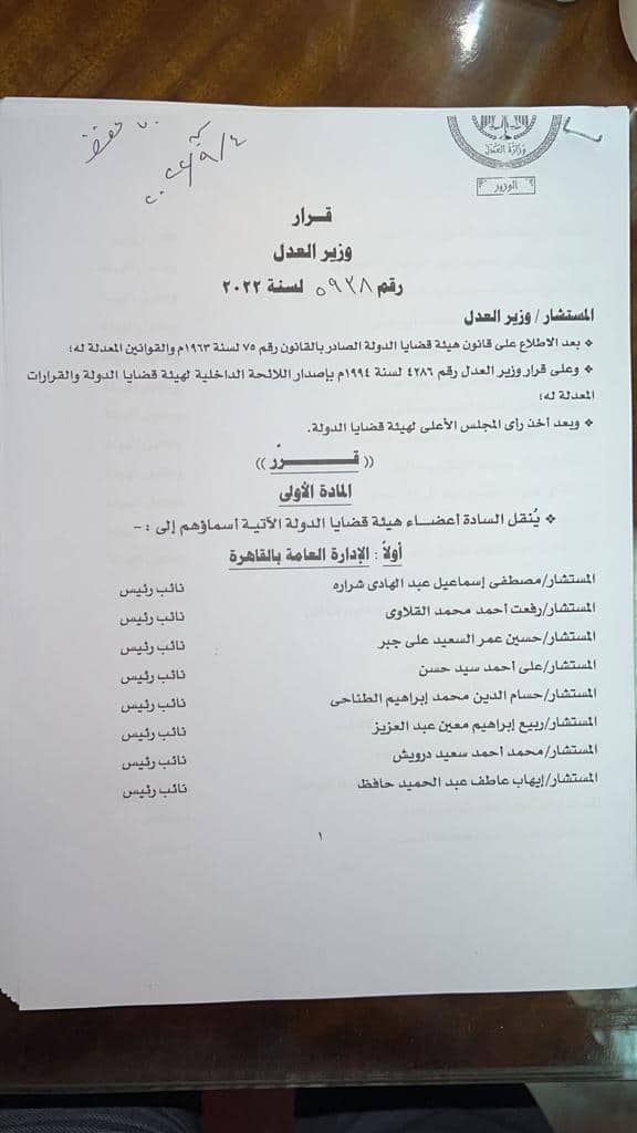 كان المستشار وزير العدل رقم ٥٩٣٨ لسنة ٢٠٢٢ اصدر حركة التنقلات الخارجية لهيئة قضايا الدولة وذلك بعد أخذ رأي المجلس الأعلى للهيئة برئاسة المستشار محمد بكر رئيس قضايا الدولة.