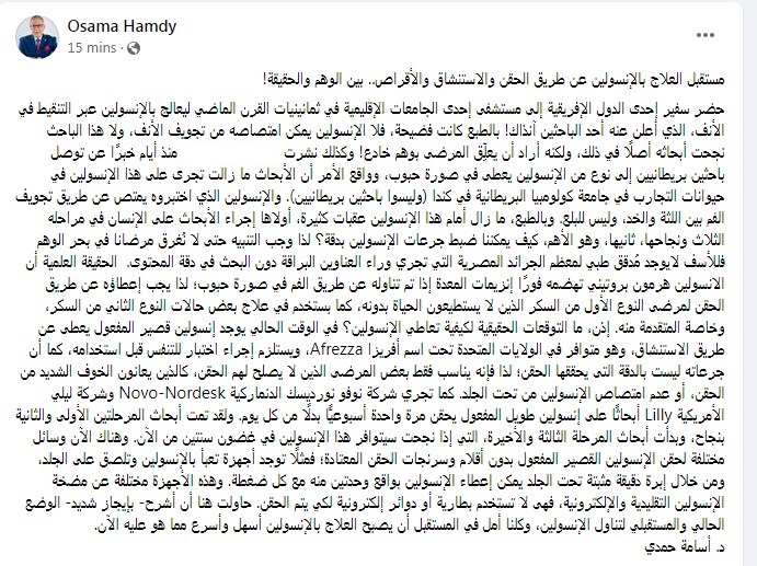 وكتب الدكتور أسامة حمدي تدوينة على الفيس بوك عن "مستقبل العلاج بالأنسولين عن طريق الحقن أو الاستنشاق والأقراص.. بين الوهم والحقيقة".