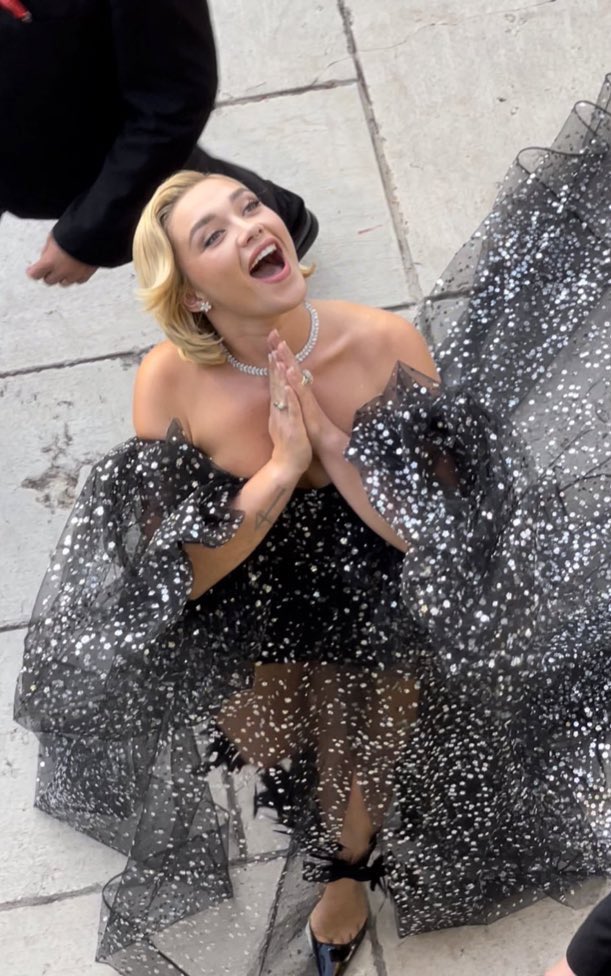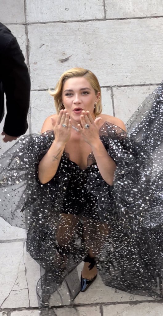 واختارت الممثلة فلورنس بيو للظهور على السجادة الحمراء، بفستان جريء باللون الأسود ومطرز بالفضي، أشبه بالهوت شورت من الأسفل، فيما اتسم الجزء العلوي من الفستان بالأناقة والجمال.