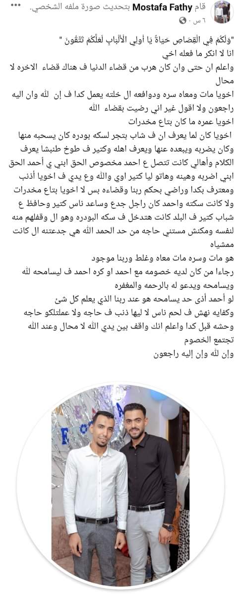 وقال أبو عميرة "وَلَكُمْ فِي الْقِصَاصِ حَيَاةٌ يَا أُولِي الْأَلْبَابِ لَعَلَّكُمْ تَتَّقُونَ.. أنا لا أنكر ما فعله أخي وأعلم أن حتى إن كان هرب من قضاء الدنيا فهناك قضاء الآخرة لا محال، أخويا مات ومعاه سره ودوافعه اللي خلته يعمل كدا فإنا لله وإنا إليه راجعون ولا أقول غير إني رضيت بقضاء الله".