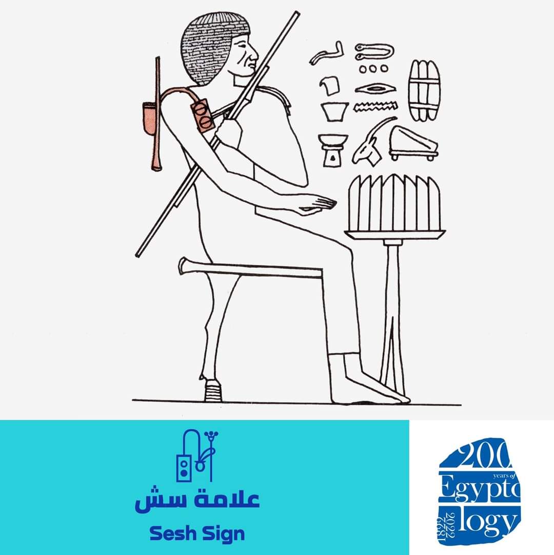 وتمثل هذه العلامة أدوات الكتابة المُكونة من قلم بردي، ومحبرة، وإناء صغير يربطهم جميعًا حبل، وجاءت كعلامة ضمن كلمة "سشو" بمعني "الكتابات"، أما الدائرتين الصغيرتين بداخل المحبرة فهما لوضع الحبر الأحمر والأسود بداخلهما.