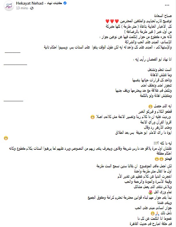 وتابعت نهاد أبو القمصان قائلة: "علشان أول مرة يلاقو حد دارس شريعة وقانون وبيعرف ينقي زيهم من النصوص ويرد عليهم لما يرهبوا الستات بكلام مقطوع وكأنه أحكام مطلقة فهمتو لكن اجمل مافي الموضوع إن بقالنا سنين نسمع الست ملزمة أول ما اتقال مش ملزمة واحدة انفجرت الدنيا عن كلام عظيم عن تقدير الأم وقيمة الأسرة والمودة والرحمة والحب وبلاش ننتقي اللي يعمل مشاكل تمام وزي الفل".