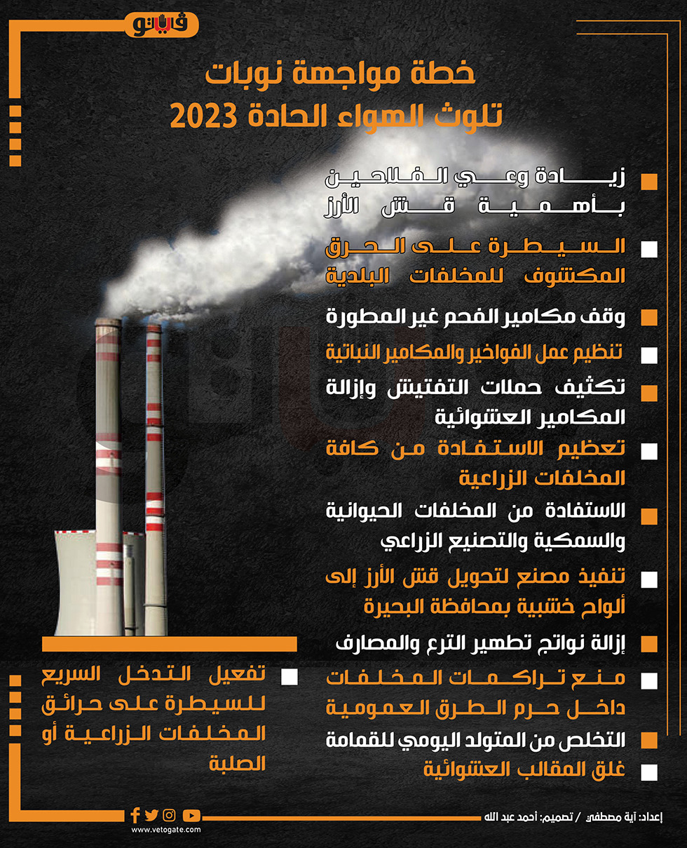 خطة مواجهة نوبات تلوث الهواء الحادة 2023 | إنفوجراف الأربعاء 07/سبتمبر/2022 - 05:35 م 9/7/2022 5:35:34 PM تلوث الهواء آية مصطفى شارك طباعة 18 حجم الخط شارك طباعة تطهير الترع والمصارف المقالب العشوائية المخلفات الزراعية نوبات تلوث الهواء مواجهة نوبات تلوث الهواء الحادة مواجهة نوبات تلوث الهواء نوبات تلوث الهواء الحادة