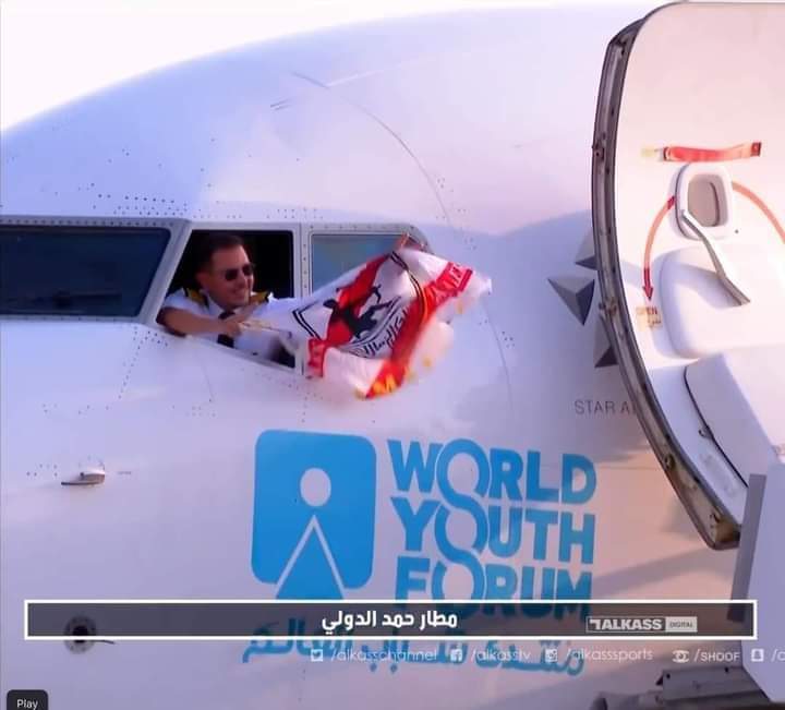 طيار مصري يرفع علم الزمالك من نافذة الطائرة فور وصول الفريق إلى قطر