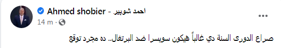 وكتب شوبير على حسابه الشخصي على موقع التواصل الاجتماعي فيسبوك: "صراع الدوري السنة دي غالبًا هيكون سويسرا ضد البرتغال.. ده مجرد توقع" في إشارة إلى قرب تعاقد الأهلي مع مدير فني سويسري لقيادة الفريق الأول، ويكون في منافسة قوية مع البرتغالي جيسفالو فيريرا المدير الفني لفريق الزمالك.