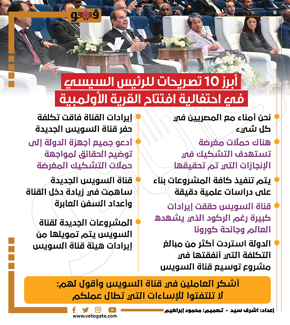 أبرز 10 تصريحات للرئيس السيسي في احتفالية افتتاح القرية الأولمبية| إنفوجراف الخميس 08/سبتمبر/2022 - 03:09 م 9/8/2022 3:09:53 PM أشرف سيد شارك طباعة 18 حجم الخط شارك طباعة قناة السويس الجديدة قناة السويس إيرادات هيئة قناة السويس توسيع قناة السويس العاملين في قناة السويس