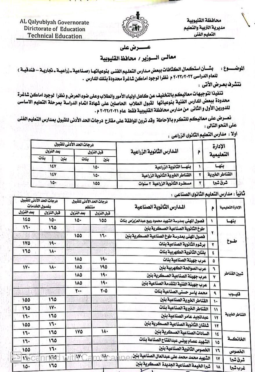 وافق عبد الحميد الهجان محافظ القليوبية على ما تم عرضه من الدكتور ياسر محمود وكيل وزارة التربية والتعليم بالقليوبية بشأن تخفيض الحد الأدنى للقبول بمدارس التعليم الفني بنوعياتها (صناعية - زراعية - تجارية - فندقية)، وكذلك فصول الخدمات وذلك تيسيرا على أولياء الأمور والطلاب مع إتاحة استمرار التقدم للالتحاق بالمدارس الفنية حرصا على مستقبل الطلاب