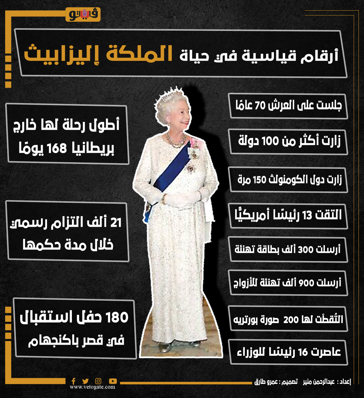 أرقام قياسية في حياة الملكة إليزابيث | إنفوجراف الجمعة 09/سبتمبر/2022 - 01:45 ص 9/9/2022 1:45:25 AM الملكة إليزابيث عبدالرحمن منير شارك طباعة 18 حجم الخط شارك طباعة اليزابيث وفاة الملكة إليزابيث الملكة إليزابيث اليزابيث الثانية