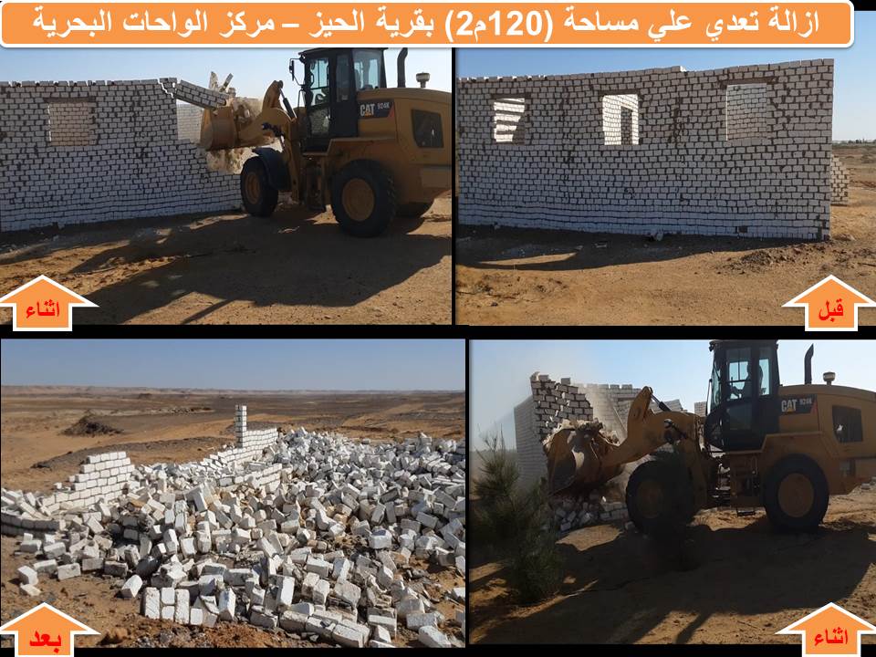 واطلع محافظ الجيزة على جهود مركز الواحات البحرية فى إزالة تعدىات على الأراضي املاك الدولة بقري منديشة والقصر والحارة والحيز وايضا ازالة تعدي علي ارض الأستثمار بمنطقة الهفوف حيث شملت الحملة إزالة منشأت غير مسقوفة ومنشآت واسوار من بلوك الحجر الجيري بارتفاعات مختلفة بالإضافة الي إزالة استراحات مقامه بالمخالفة كما تم ازالة غرف مكتملة البناء واخري مسقوفة بالخشب بمنطقة الحيز والباويطي وذلك بمساحات إجمالية بلغت (385 فدان زراعي 6326م2 مباني ).