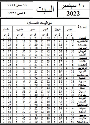 مواقيت الصلاة اليوم وفقًا للتوقيت المحلي لمدينتي القاهرة والإسكندرية وعدد من مدن ومحافظات الجمهورية من واقع بيانات الهيئة العامة للمساحة: