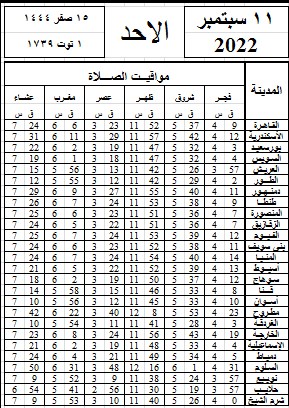 مواقيت الصلاة اليوم وفقًا للتوقيت المحلي لمدينتي القاهرة والإسكندرية وعدد من مدن ومحافظات الجمهورية من واقع بيانات الهيئة العامة للمساحة: