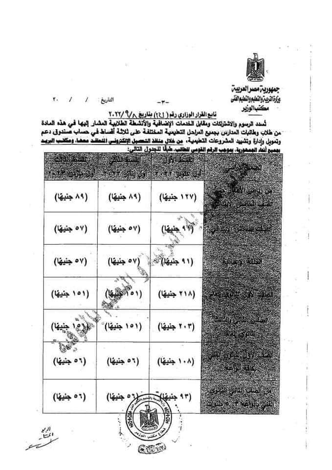 وكان الدكتور رضا حجازي وزير التربية والتعليم والتعليم الفني، اعتمد القرار الوزاري الخاص بتحديد الرسوم والغرامات والاشتراكات ومقابل الخدمات الإضافية التي تحصل من طلاب وطالبات المدارس بمختلف مراحل التعليم العام والفني للعام الدراسي 2023/2022.
