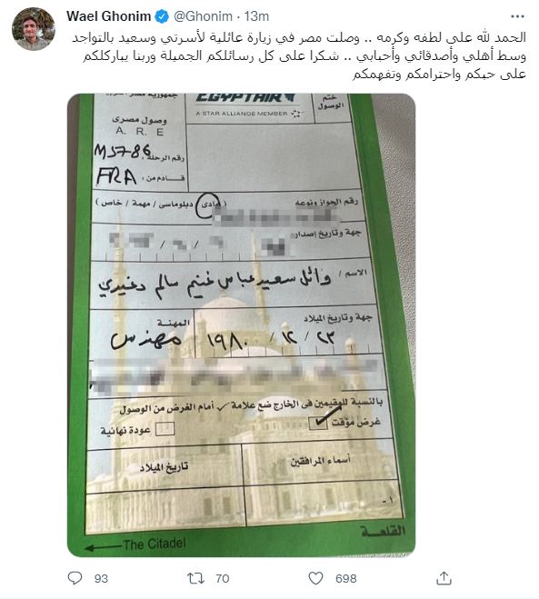 ونشر وائل غنيم صورة من أوراق وصوله إلى مصر وعلق عليها قائلا: "الحمد لله على لطفه وكرمه.. وصلت مصر في زيارة عائلية لأسرتي وسعيد بالتواجد وسط أهلي وأصدقائي وأحبابي.. شكرا على كل رسائلكم الجميلة وربنا يباركلكم على حبكم واحترامكم وتفهمكم".