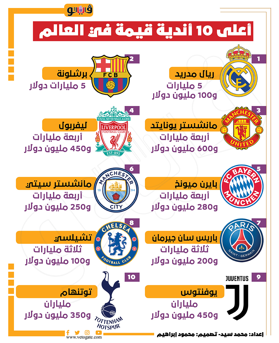 أعلى 10 أندية قيمة في العالم | إنفوجراف السبت 10/سبتمبر/2022 - 07:45 م 9/10/2022 7:45:41 PM ريال مدريد وليفربول محمد سيد شارك طباعة 18 حجم الخط شارك طباعة ريال مدريد تشيلسي باريس سان جيرمان برشلونة بايرن ميونخ مانشسترسيتي يوفنتوس توتنهام ليفربول