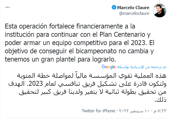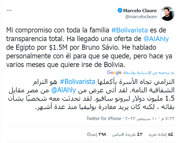 وكتب رئيس بوليفار عبر حسابه على "تويتر": "التزاما بالشفافية مع جماهير نادينا، تلقينا عرضا من الأهلي المصري قيمته 1.5 مليون دولار وتحدثت مع اللاعب من أجل البقاء".