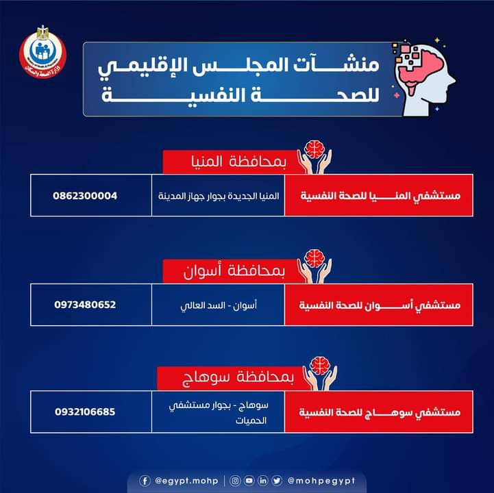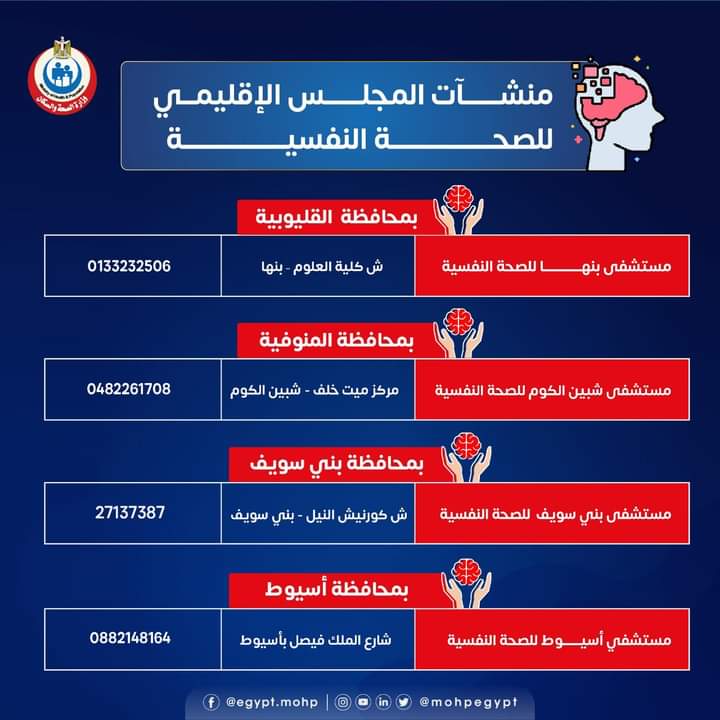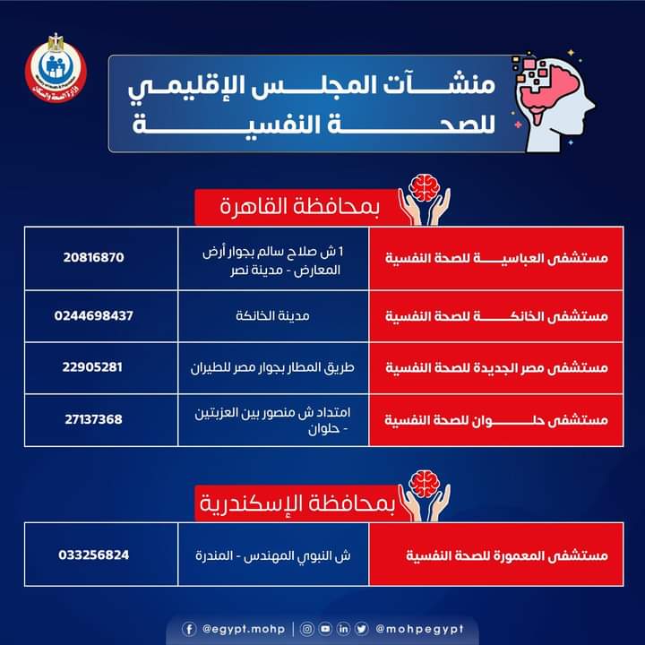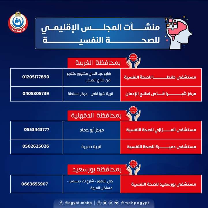 كشفت وزارة الصحة عن عناوين وأماكن مستشفيات المجلس الإقليمي للصحة النفسية على مستوى الجمهورية والتي تقدم خدمات الطب النفسي للمواطنين.