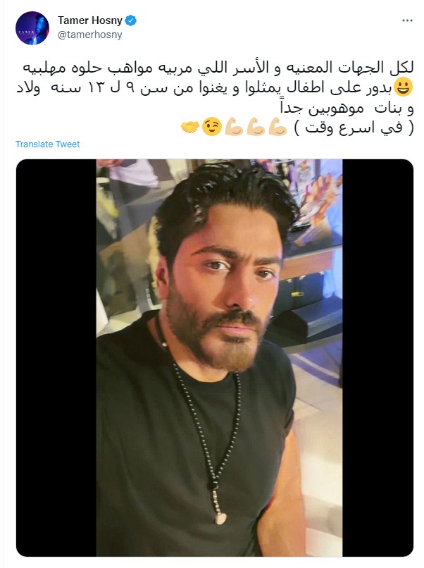 وكتب تامر حسني في تغريدة عبر حسابه بموقع التواصل الاجتماعي تويتر "لكل الجهات المعنية والأسر اللي مربية مواهب حلوة مهلبية.. بدور على اطفال يمثلوا ويغنوا من سن ٩ لـ ١٣ سنة ولاد وبنات موهوبين جدًا (في أسرع وقت)