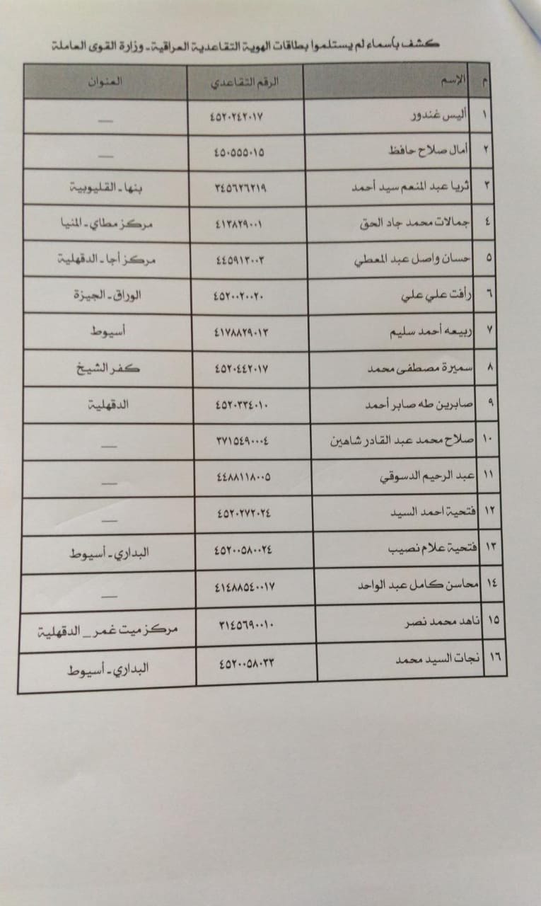 وجاء في بيان صحفي اليوم الأحد أن الوزارة تنبه الأتي أسمائهم بضرورة الحضور لاستلام الهويات، ثم التوجه إلى بنك الرافدين فرع القاهرة لمقابلة اللجنة المختصة بالمعاشات التقاعدية العراقية خلال الفترة من 11 إلى 15 سبتمبر الجاري، والأسماء هي: أليس غندور، وأمال صلاح حافظ، وثريا عبد المنعم سيد أحمد، وجمالات محمد حاد الحق، وحسان واصل عبد المعطي، ورأفت علي علي، وربيعة أحمد سليم، وسميرة مصطفى محمد، وصابرين طه صابر محمد، وصلاح محمد عبد القادر شاهين، وعبد الرحيم الدسوقي، وفتحيه أحمد السيد، وفتحيه علام نصيب، ومحاسن كامل عبد الواحد، وناهد محمد نصر، ونجات السيد محمد.