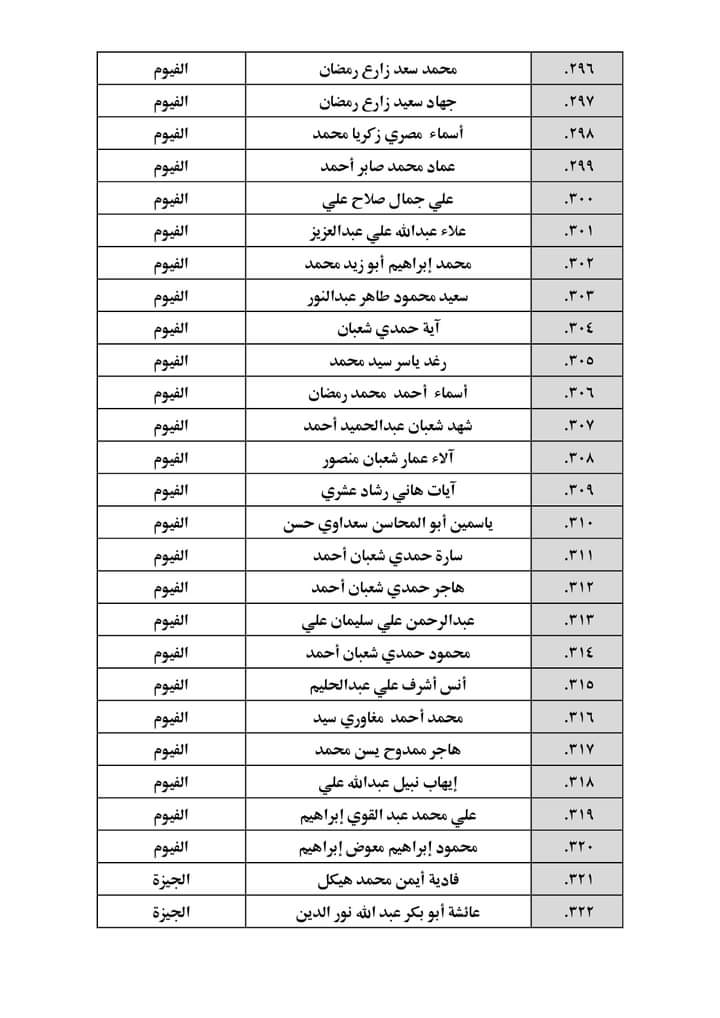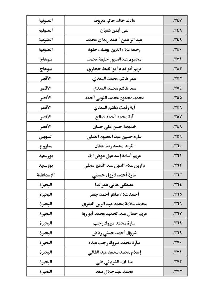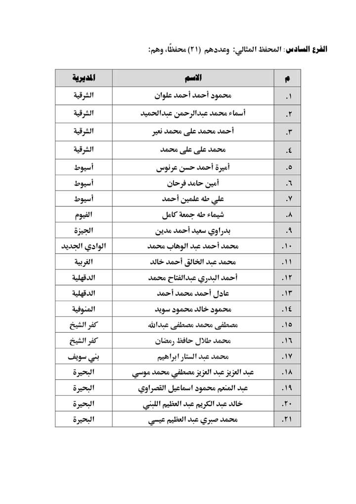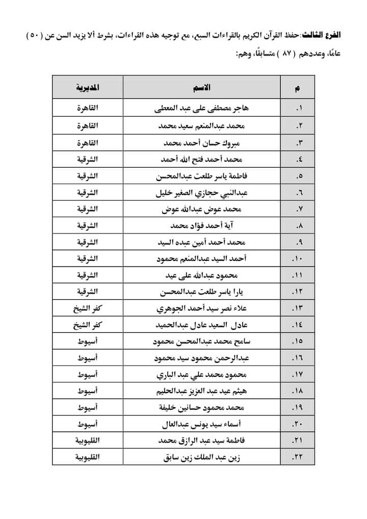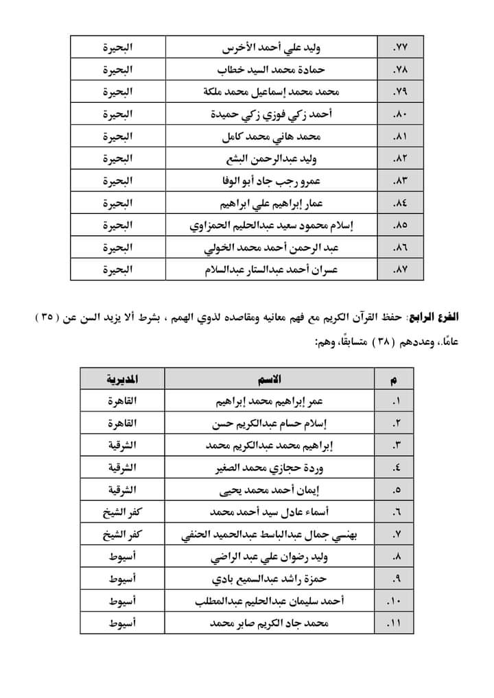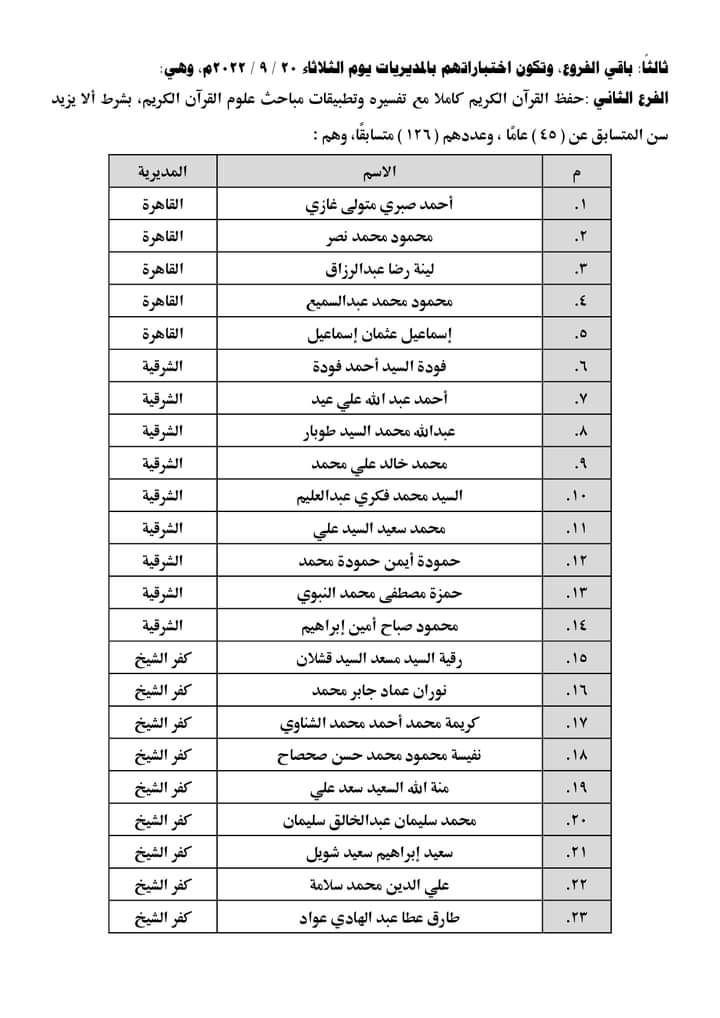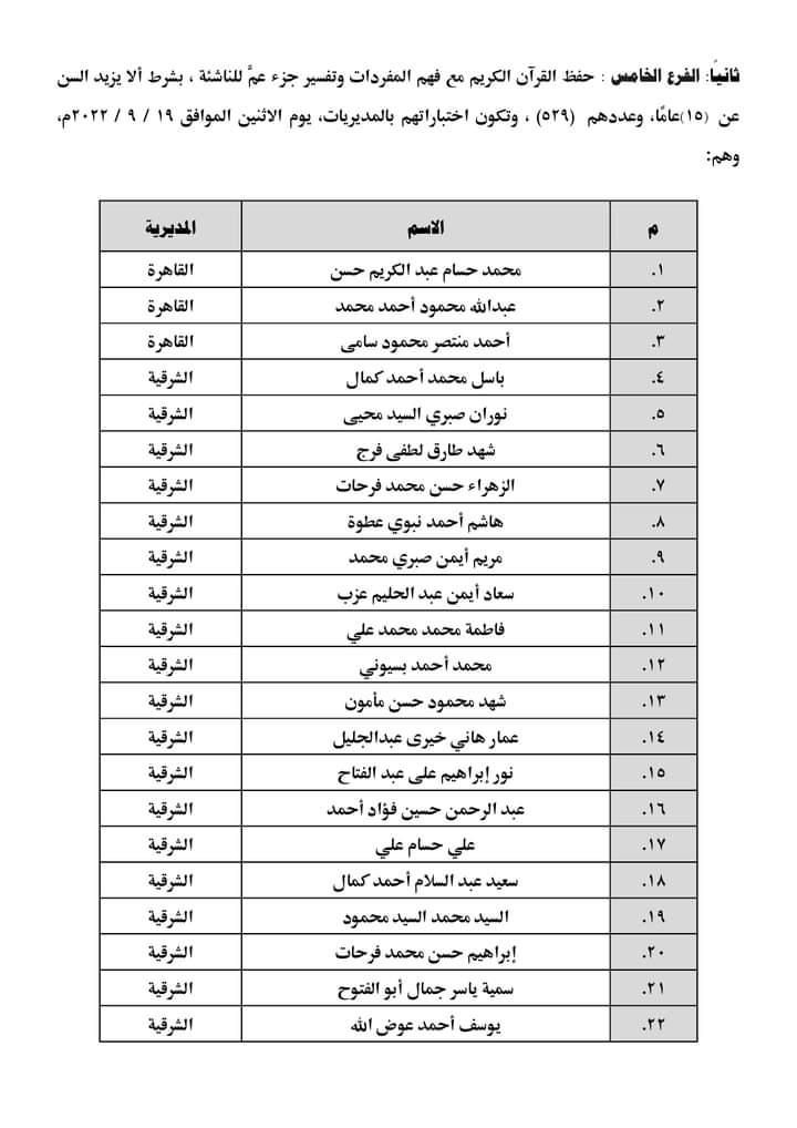 أولًا: الفرع الأول: حفظ القرآن الكريم كاملا وفهم معانيه ومقاصده العامة لأصحاب الصوت الحسن من الجنسين بشرط ألا يزيد السن عن (45) عامًا، وعددهم (857) متسابقًا، وتكون اختباراتهم بالمديريات يوم الأحد الموافق 18 / 9 / 2022م وهم: