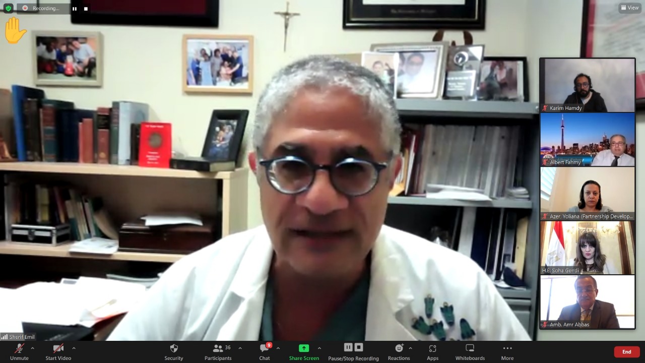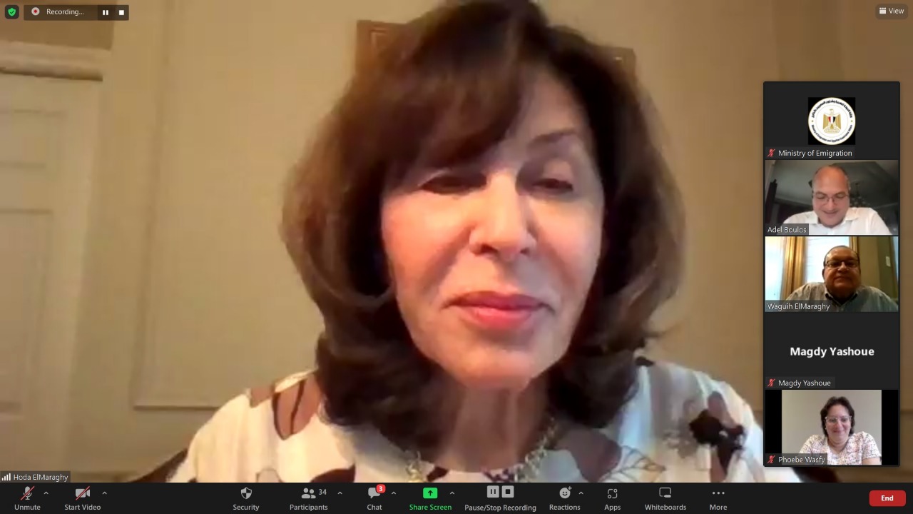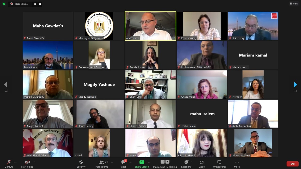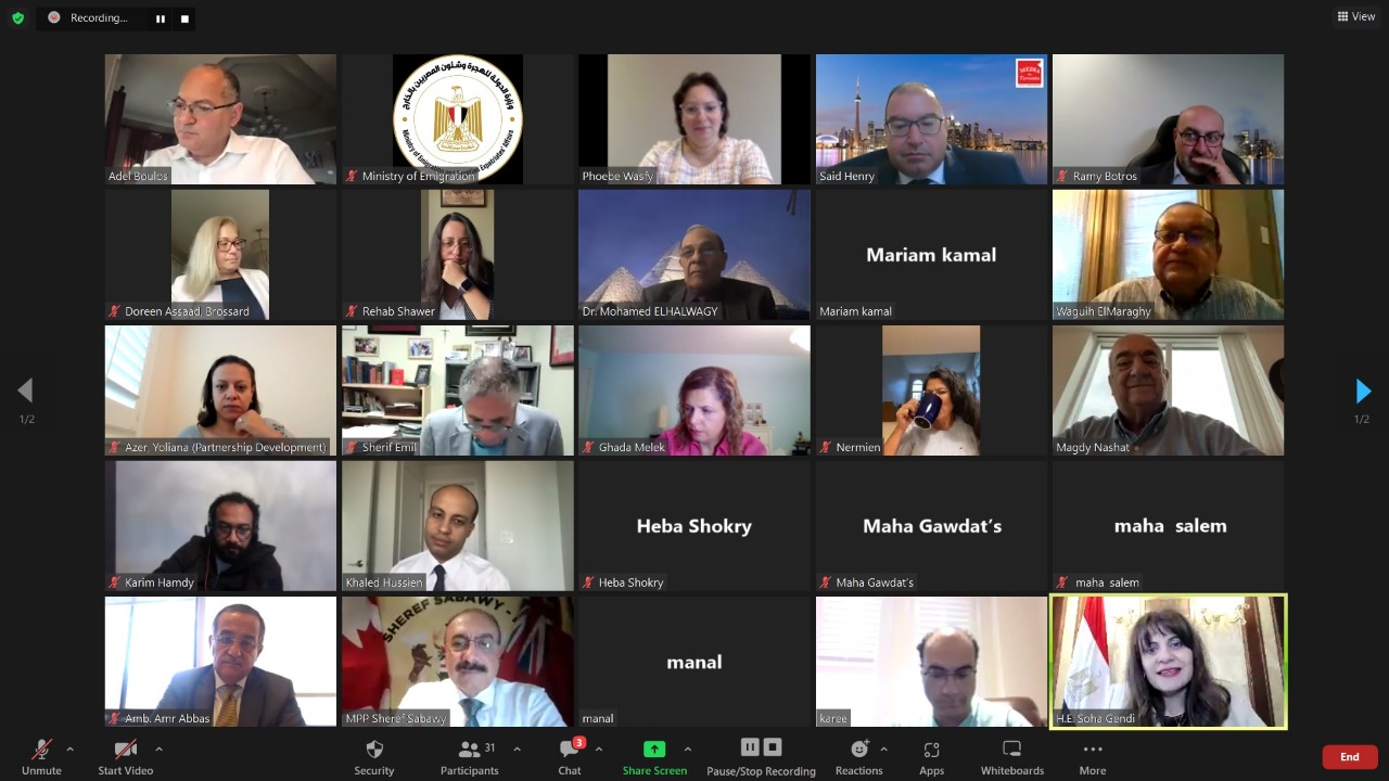 وبحضور عدد من أبرز رموز الجالية المصرية بكندا، بدأ اللقاء الافتراضي بتوجيه الأستاذ عادل بولس، رئيس الجمعية المصرية الكندية لرجال الأعمال، ومنظم اللقاء، التقدير والشكر للوزيرة سها جندي على تنظيم المؤتمر الثالث للكيانات المصرية بالخارج، وما تبذله من جهد منذ توليها منصب وزيرة الهجرة، للتواصل والوقوف على أوضاع الجاليات المصرية في مختلف دول العالم.
