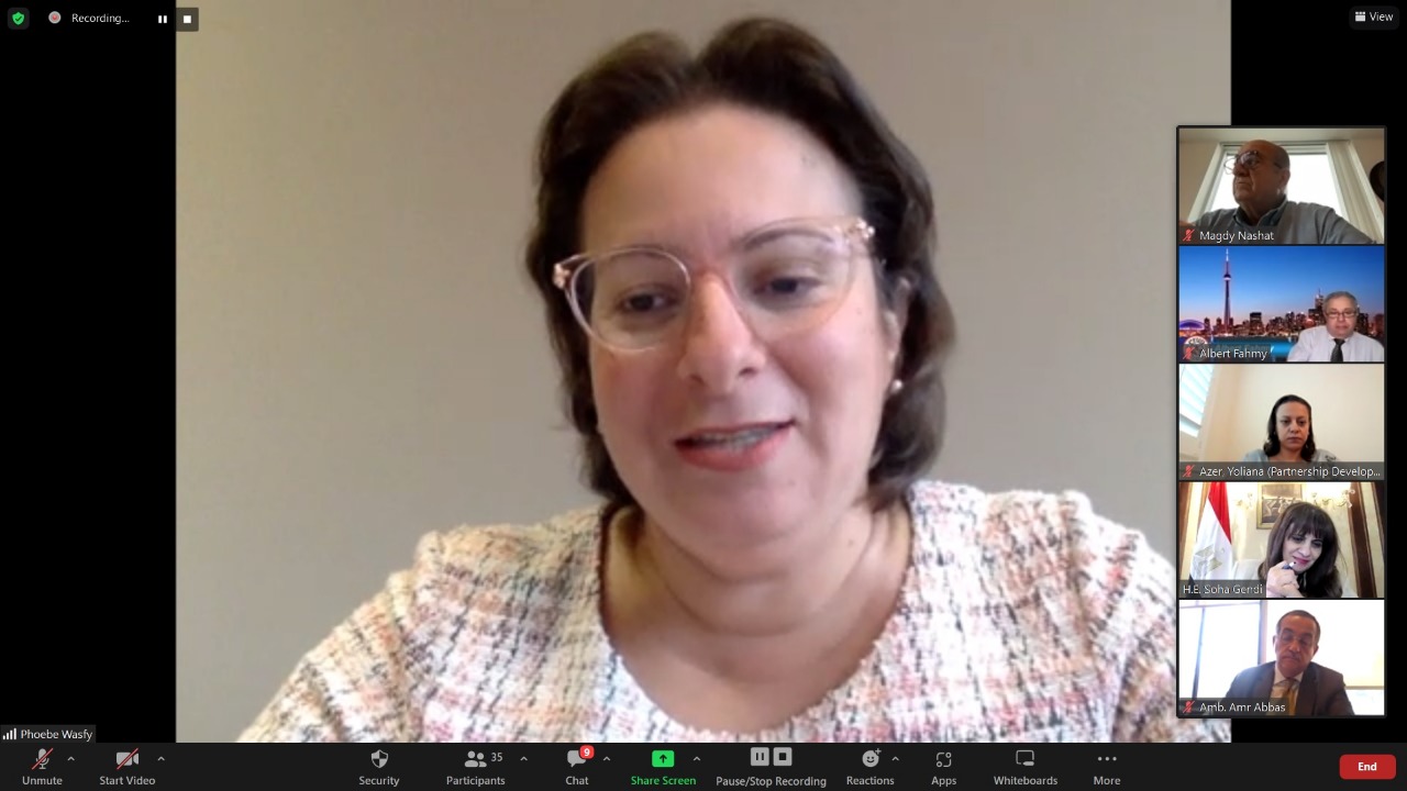 عقدت السفيرة سها جندي، وزيرة الدولة للهجرة وشئون المصريين بالخارج، لقاء افتراضيا عبر تطبيق زووم، مع 35 مصريا من رموز الجالية المصرية بكندا، لمناقشة أوضاع الجالية والاستماع إلى أفكارهم وأطروحاتهم الخاصة بخلق مزيد من الربط بين أعضاء الجالية ووطنهم مصر خلال الفترة المقبلة، بما يلبي احتياجات المصريين في كندا.