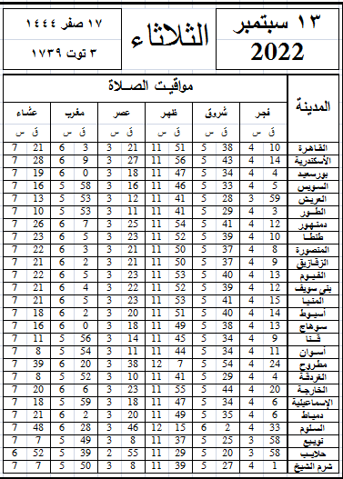 مواقيت الصلاة اليوم وفقًا للتوقيت المحلي لمدينتي القاهرة والإسكندرية وعدد من مدن ومحافظات الجمهورية من واقع بيانات الهيئة العامة للمساحة: