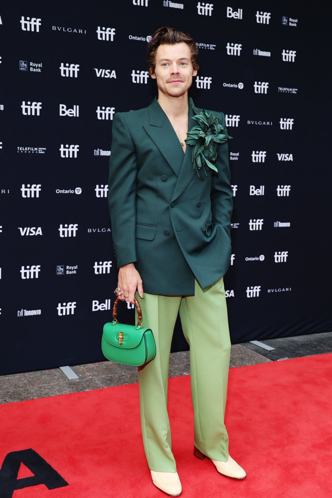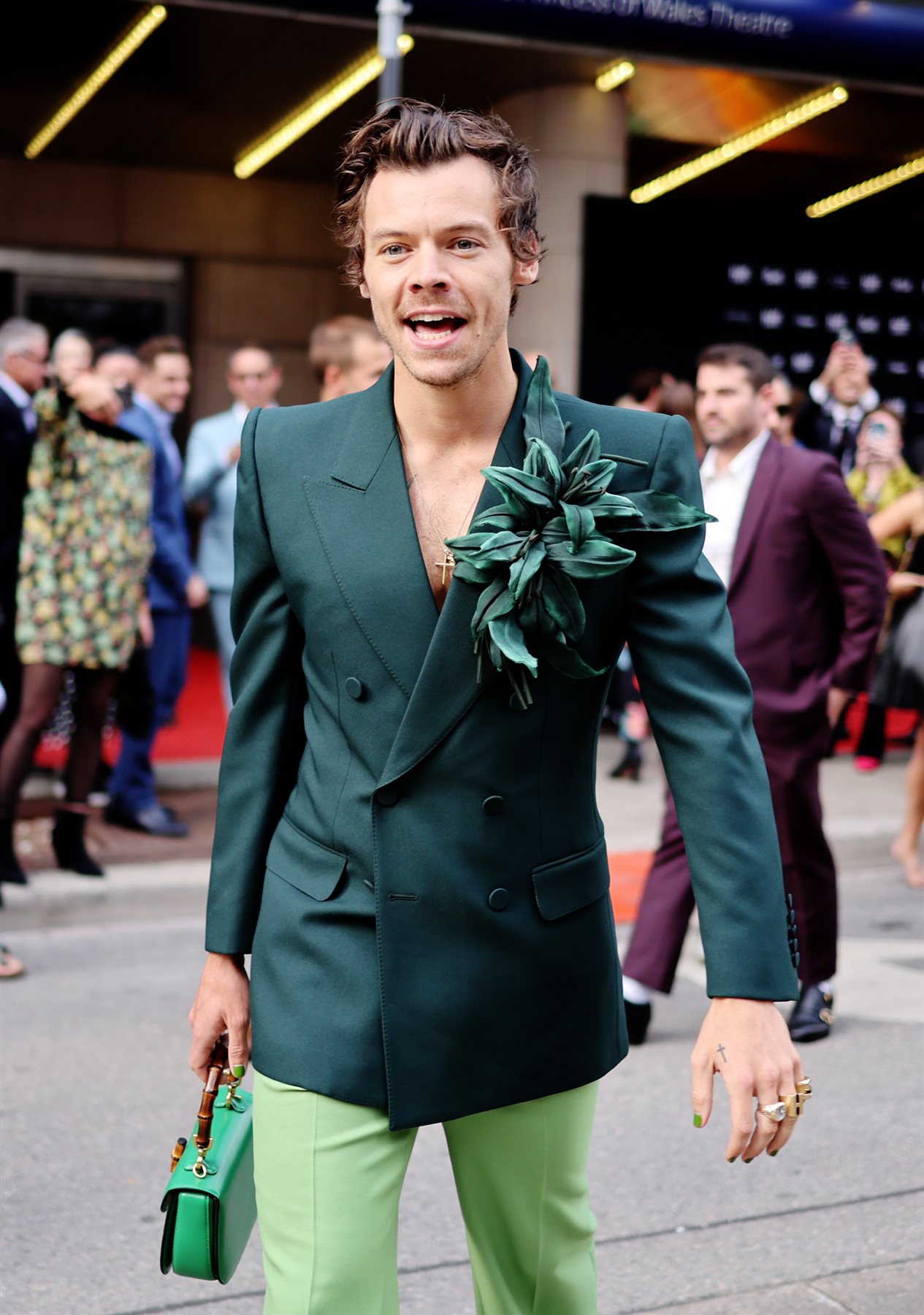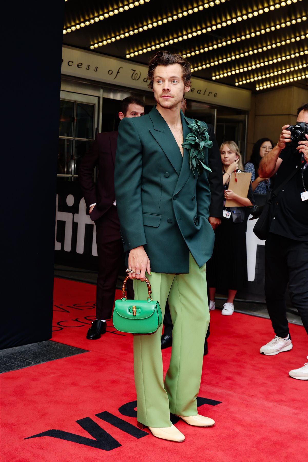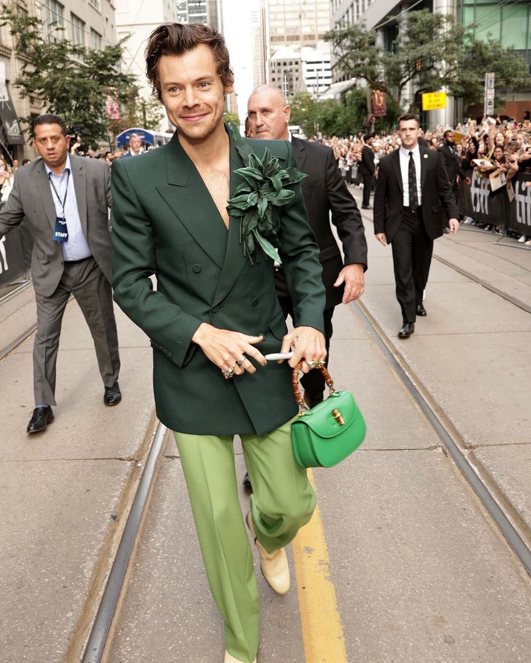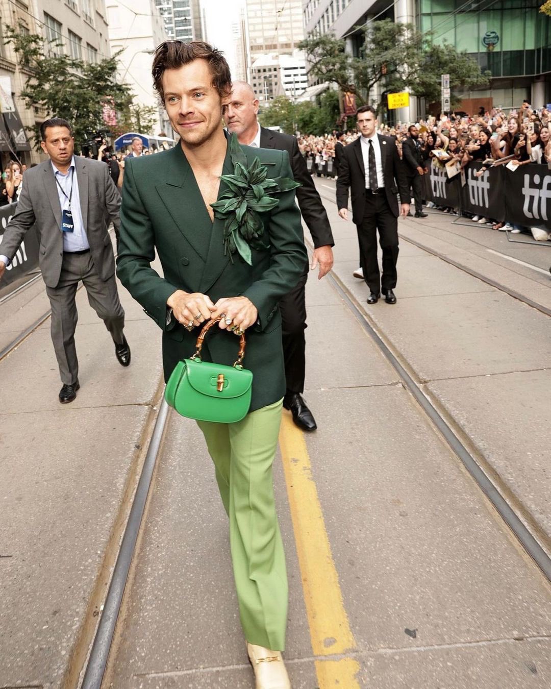 واختار هاري ستايلز شنطة نسائية باللون الأخضر، ويد خشبية، فيما ارتدى بذلة من اللون الزيتي والأخضر، خلال مروره على السجادة الحمراء لمهرجان فينيسيا.
