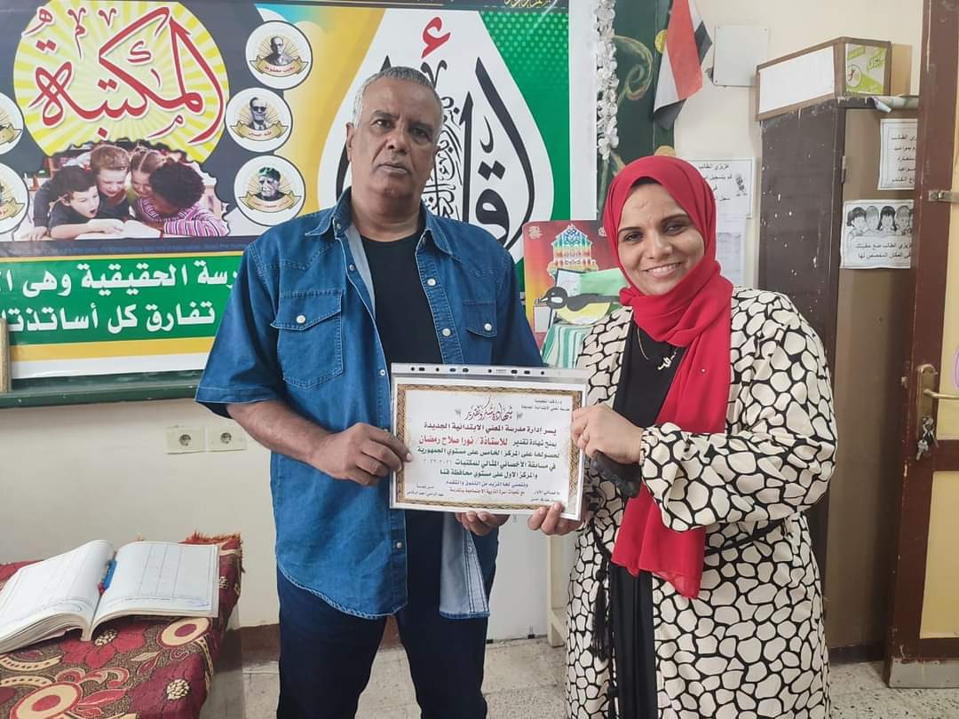 حصلت المعلمة نورا صلاح بمدرسة المعنا الابتدائيه المشتركة بمحافظة قنا علي المركز الخامس علي مستوى الجمهوريه والاول علي محافظه قنا للمعلم المثالي.
