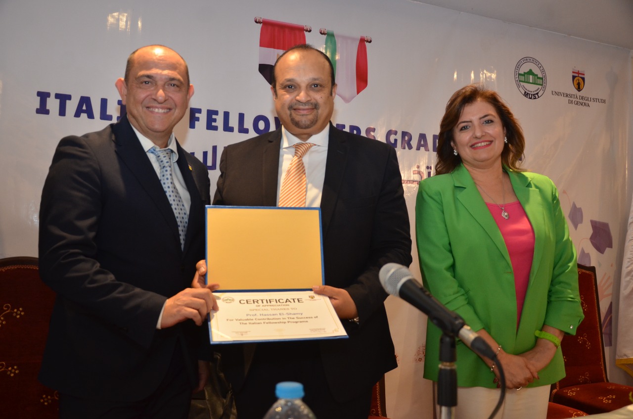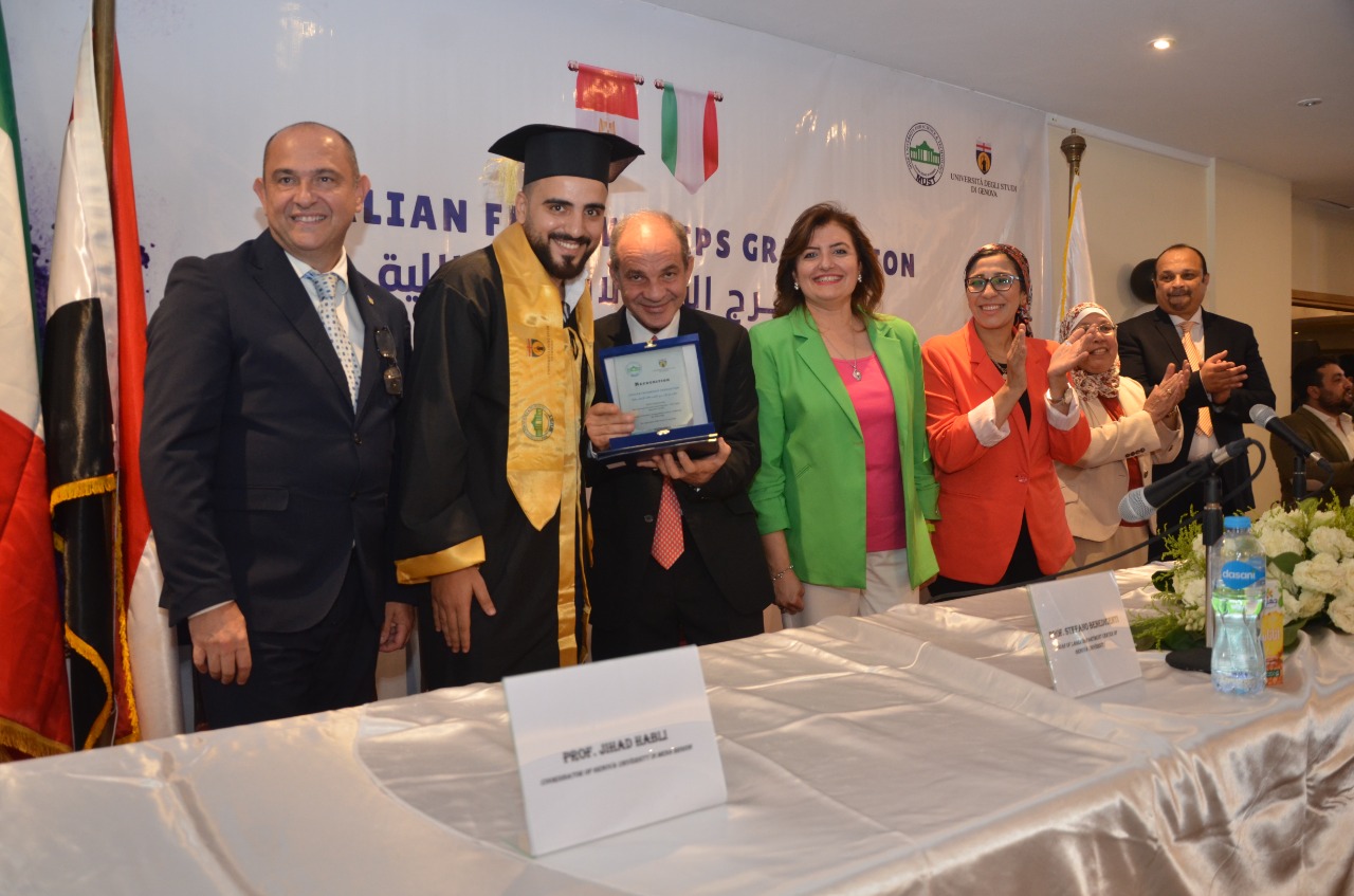 وعلى هامش الحفل قامت الدكتورة هالة المنوفي عميد كلية طب وجراحة الفم والأسنان بجامعة مصر للعلوم والتكنولوجيا، وستيفانو بندشينتي عميد مركز تطبيقات الليزر بجامعة جنوة الايطالية، والدكتورة جهاد حبلي منسق جامعة جنوة الايطالية في الشرق الأوسط وشمال افريقيا بتسليم شهادات ودروع التخرج.