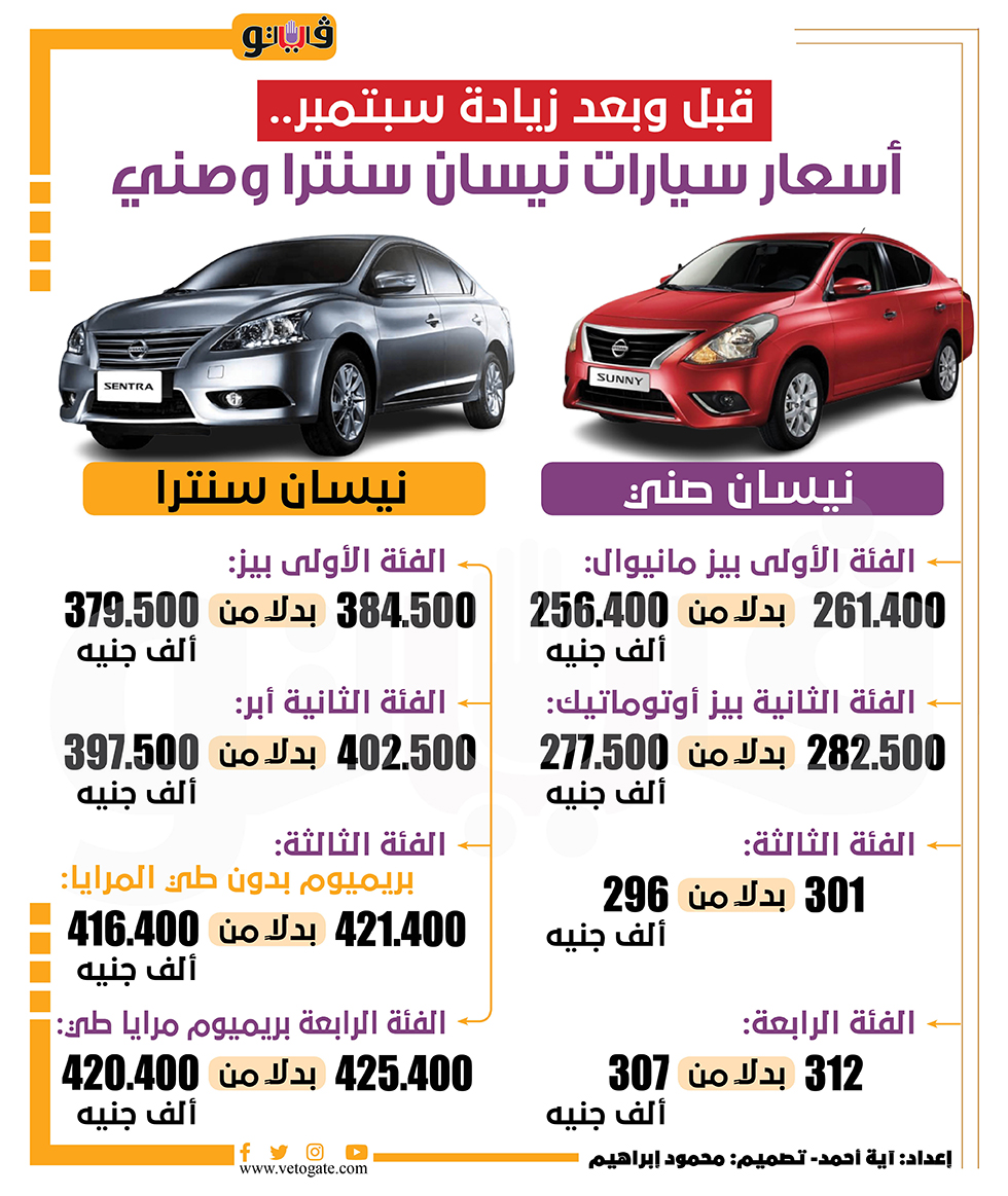 قبل وبعد زيادة سبتمبر.. أسعار سيارات نيسان سنترا وصني | إنفوجراف الإثنين 12/سبتمبر/2022 - 09:12 م 9/12/2022 9:12:29 PM سيارات آية أحمد شارك طباعة 18 حجم الخط شارك طباعة زيادة اسعار شركة نيسان نيسان سنترا نيسان صني