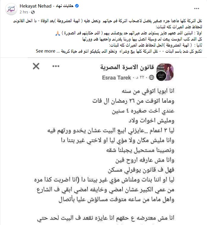 وتابعت نهاد قائلة: "أولا: البنتين اللى عمهم عايز يستولى على ميراثهم حد يوصلنى بيهم.. كل اللى كتب البوست يبعت لى وسيلة اتصل بيها وربنا يقدرنى واحميها هى وورثها، ثانيا: ( الهبة المشروطة ) الحل للحفاظ على الميراث كله للبنات: تكتبو كل شئ باسم البنات، نقل التركة كلها بيع وشراء وتخلو اللى يكيفيكو انتو فى حياة كريمة، وتعملو في الجزء اللى خلتوه باسمكو ايه؟ علشان ما يروحش لحد غير البنات تعملو (هبة مشروطة بالوفاة) يعنى بتوهبوها للبنات بشرط انتقال الملكية بعد الوفاة لكن طول ما انتو عايشين تتحكمو فيها وفى عوائدها"