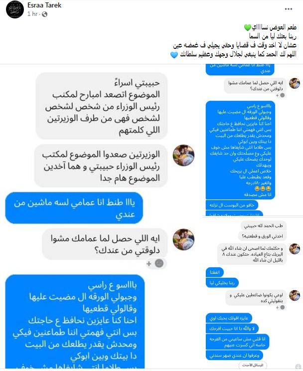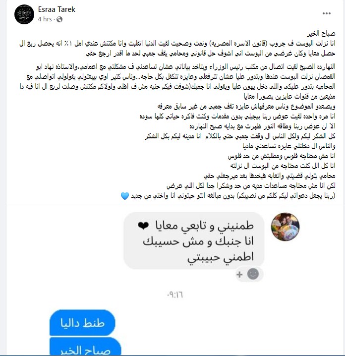 وتابعت إسراء حكايتها فقالت: "النهارده الصبح لقيت اتصال من مكتب رئيس الوزراء وبتاخد بياناتي عشان تساعدني في مشكلتي مع اعمامي، والاستاذه نهاد أبو القمصان نزلت البوست عندها وبتدور عليا عشان تترفعلي وعايزه تتكفل بكل حاجه... وناس كتير اوي بيبعتولي يقولولي اتواصلي مع المحاميه بتدور عليكي واللي دخل يهون عليا ويقولي انا جمبك (شوفت فيكم حنيه مش ف اهلي ولولاكم مكنتش وصلت لربع ال انا فيه دا مذيعين من قنوات عايزين يصورا معايا ويصعدو الموضوع وناس معرفهاش عايزه تقف جمبي من غير سابق معرفه، انا مره واحده لقيت عوض ربنا بيجيلي بدون مقدمات وكنت فاكره حياتي كلها سوده، الا ان عوض ربنا وطاقه النور ظهرت مع بدايه صبح النهارده"
