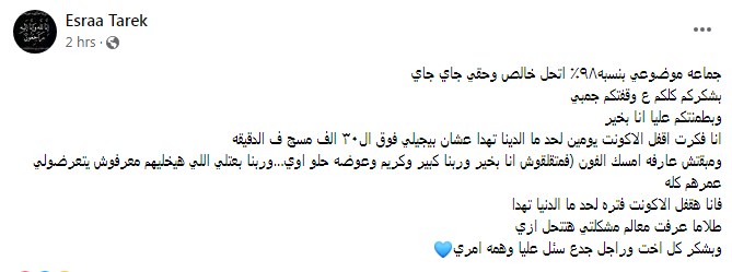 وأضافت إسراء "جماعه موضوعي بنسبه ٩٨٪ اتحل خالص وحقي جاي جاي بشكركم كلكم على وقفتكم جمبي وبطمنتكم عليا انا بخير انا فكرت اقفل الاكونت يومين لحد ما الدينا تهدا عشان بيجيلي فوق ال٣٠ الف مسج في الدقيقه ومبقتش عارفه امسك الفون (فمتقلقوش انا بخير وربنا كبير وكريم وعوضه حلو اوي... وربنا بعتلي اللي هيخليهم معرفوش يتعرضولي عمرهم كله فانا هقفل الاكونت فتره لحد ما الدنيا تهدا طالما عرفت معالم مشكلتي هتتحل ازي وبشكر كل اخت وراجل جدع سأل عليا وهمه امري"