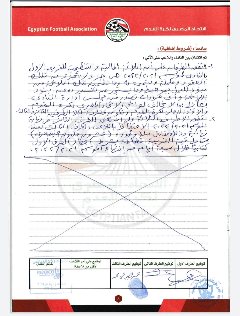 وجاء نصه كالتالي: اتفق الأطراف الثلاثة على أن يحق للطرف الثاني في نهاية الموسم 2021 /2022 الاحتفاظ باللاعب الطرف الثالث بصفة نهائية وذلك مقابل مبلغ وقدره 20 مليون جنيه مصري.