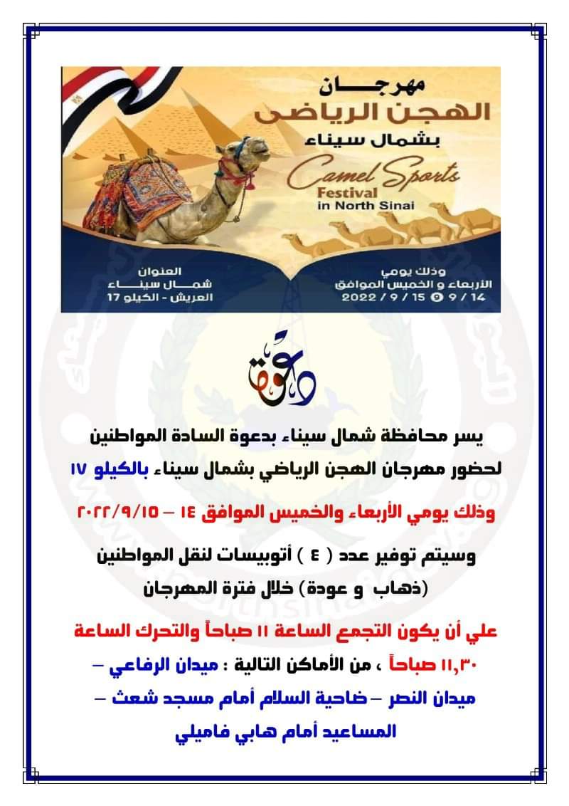 محافظة شمال سيناء تدعو المواطنين لمشاهدة سباق الهجن وتوفر 4 أتوبيسات لنقلهم