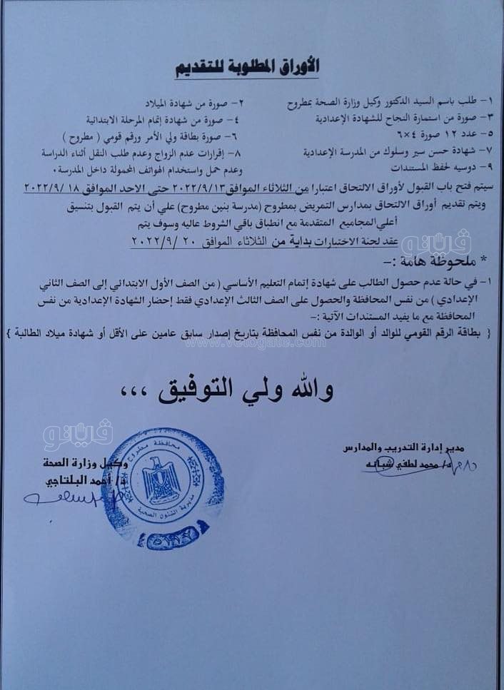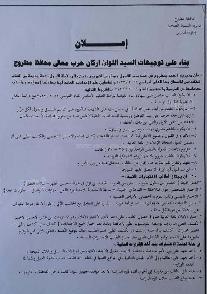 وأضافت مديرية الصحة بمطروح، أنه تم فتح باب القبول بـ9 شروط يجب أن يستوفيها المتقدم بأوراقه للقبول بالمدرسة وهي: