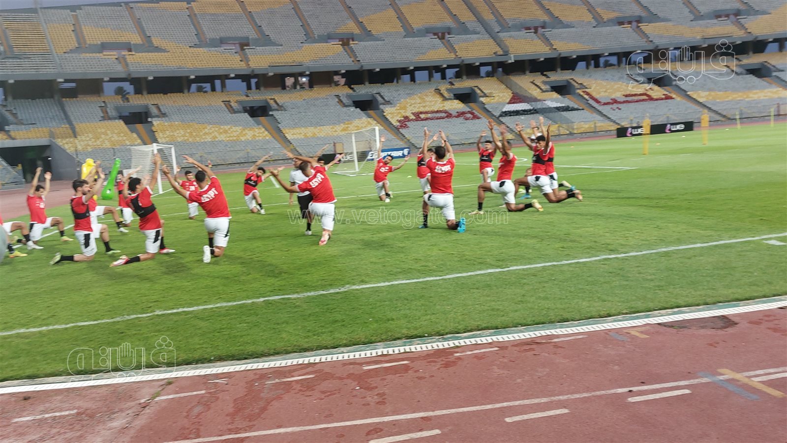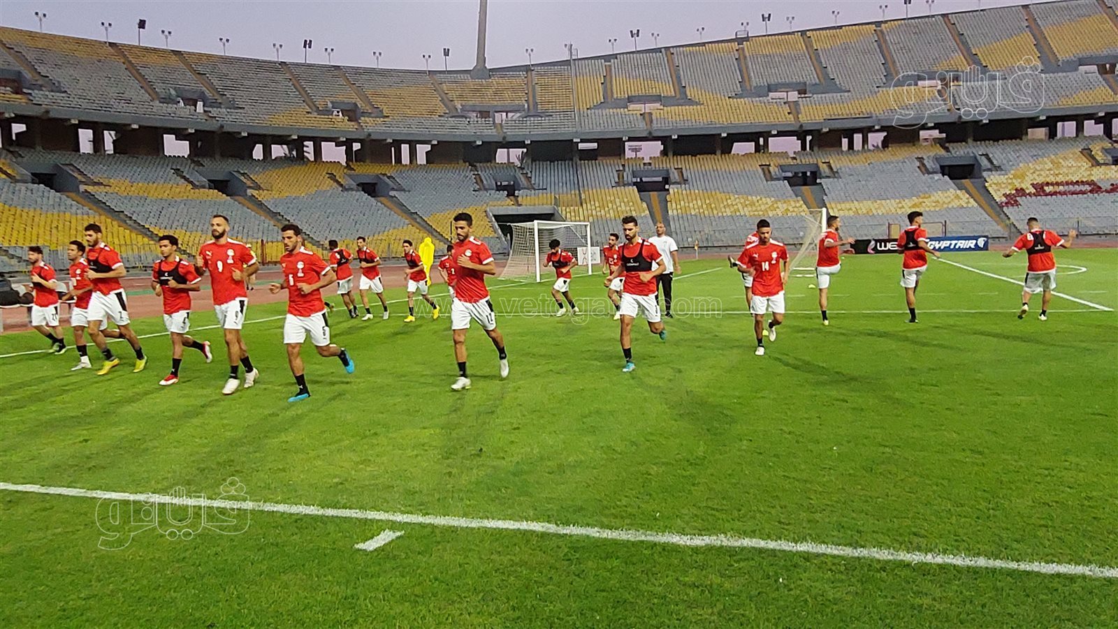 وأجرى لاعبو المنتخب عملية الإحماء على أرضية الملعب وسط متابعة الجهاز الفني لهم وتوجيههم لأداء حركات معينة، وكان أبرز اللاعبين المتواجدين محمد الشناوي حارس مرمي النادي الأهلي، ومروان محسن لاعب النادي الأهلي.