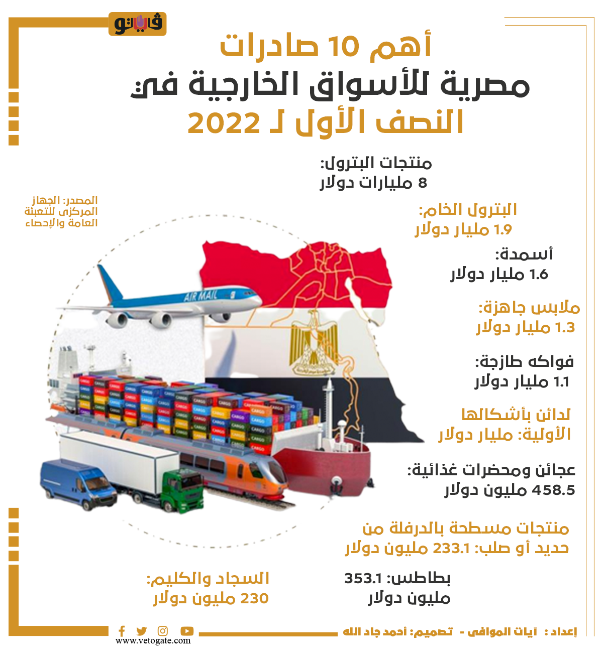 أهم 10 صادرات مصرية للأسواق الخارجية في النصف الأول لـ 2022 | إنفوجراف الأربعاء 14/سبتمبر/2022 - 01:41 م 9/14/2022 1:41:22 PM صورة أرشيفية آيات الموافى شارك طباعة 18 حجم الخط شارك طباعة ملابس جاهزة اسمدة الجهاز المركزى للتعبئة العامة والإحصاء