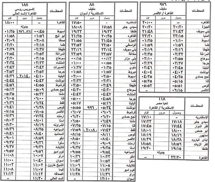 - تعديل ميعاد قيام قطار رقم 976 مكيف ( القاهرة / الأقصر ) ليقوم الساعة 20:00 بدلًا من الساعة 21:30 ويترتب عليه تعديل ميعاد قطار رقم 188 تهوية ديناميكية ( القاهرة / السد العالى ) طبقًا للجدول المرفق.